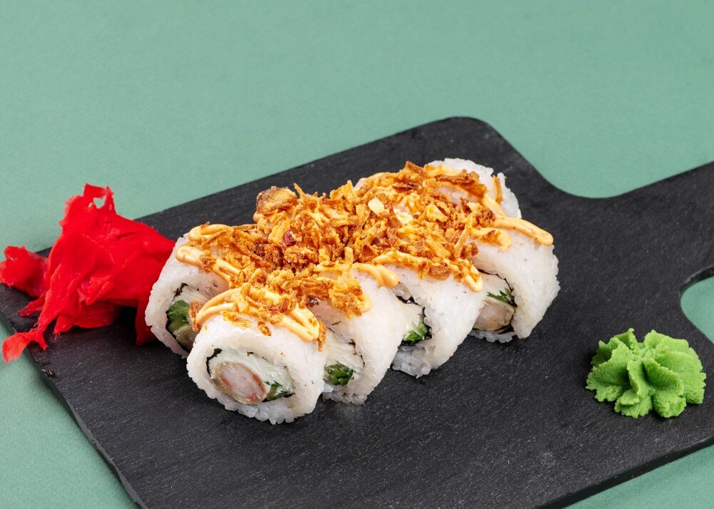 Рис, нори, огурец, креветки, жареный лук, соус спайси.