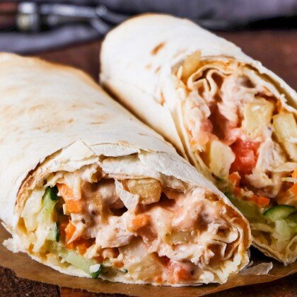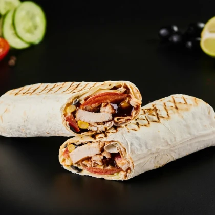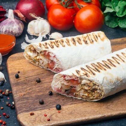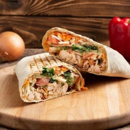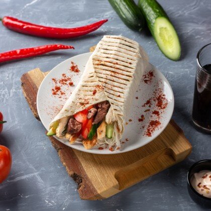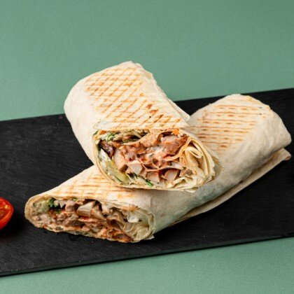Салат капустный с морковью по-корейски ,хрустящий картофель фри , помидор ,огурец,нежный чесночный соус ,армянский шашлычный соус, сочное мясо курицы ,все завернуто в хрустящий лаваш )